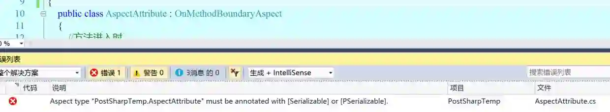 7、有一个小点需要注意,使用postsharp的时候对切面类必须添加Serializable特性,否则在编译的时候就会报错。