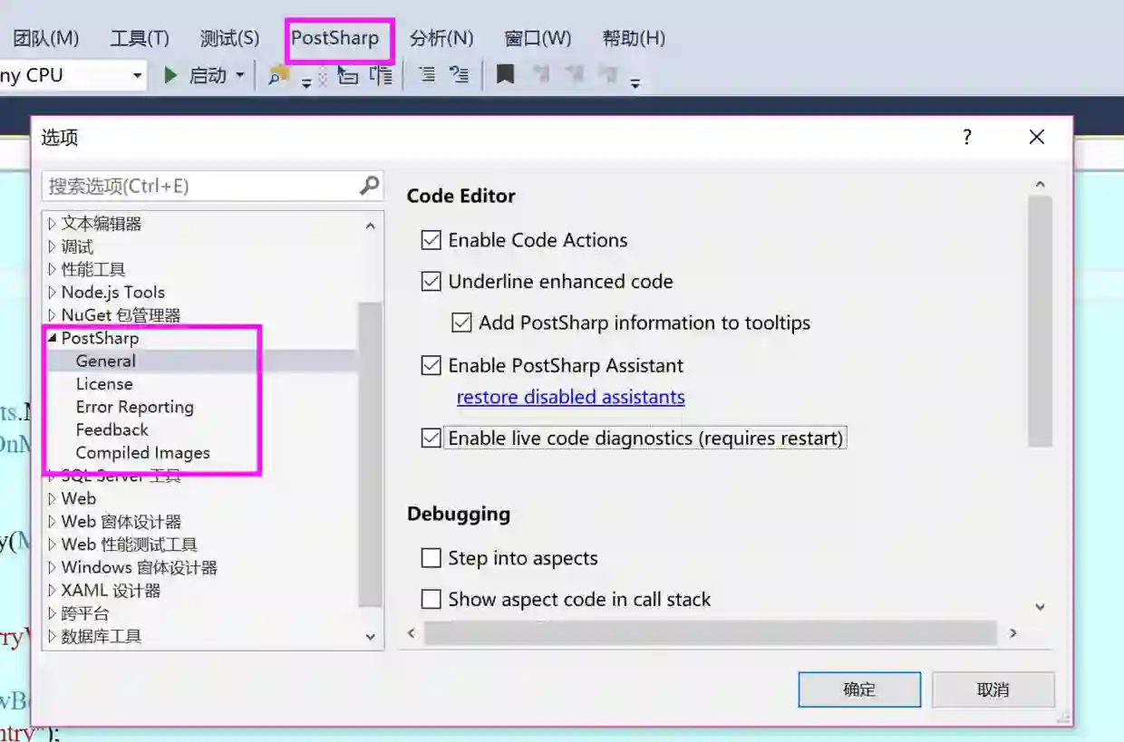 但是3.0之后是类似于VS插件的方式工作的,下载postsharp安装包安装之后会在vs的菜单中新增一个postsharp菜单(如下图),可以进行一些设置,在使用的时候不再是引用,而是需要项目上右击“添加postsharp到项目”