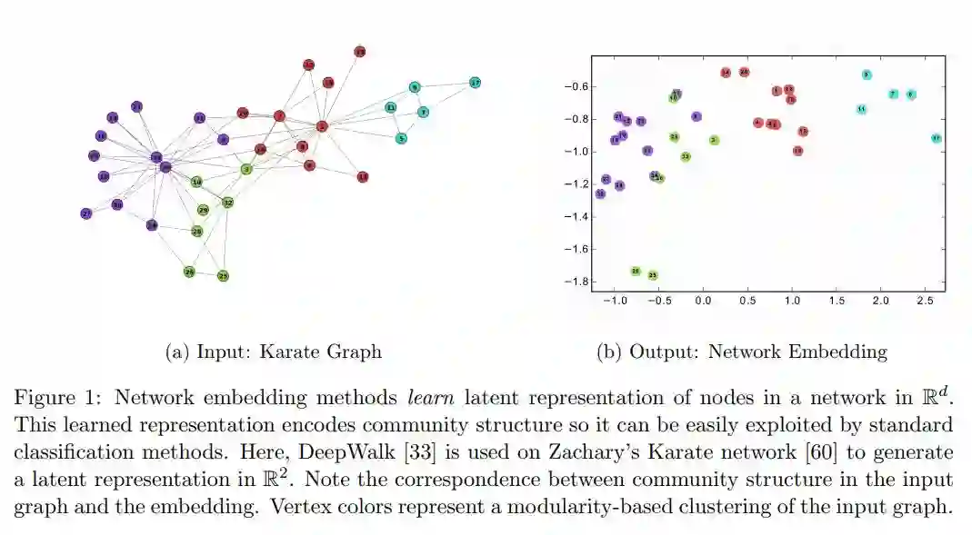 网络嵌入(Network Embedding)方法的目的是学习网络中节点的低维潜在表示。这些表示可以被用作在诸如分类、聚类、链接预测和可视化等图形上的广泛任务的特征。在这个综述中,我们总结和分类最新研究进展,形成这一研究领域的概述。文中首先讨论了网络嵌入的理想特性,并简要介绍了网络嵌入算法的发展历史。然后,讨论了在不同场景下的网络嵌入方法,如有监督与无监督学习、同质网络的学习嵌入和异构网络的嵌入等。我们进一步展示了网络嵌入的应用,并对未来的工作进行了总结。