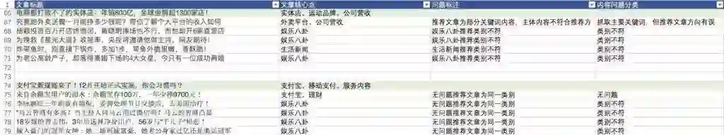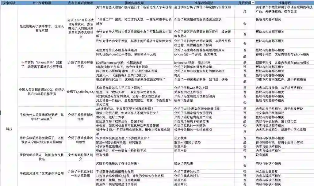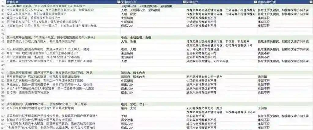 如上图所示,通过抽取数据对50个推荐文章内容数据进行问题标注与问题分类,分为以下几个类别: