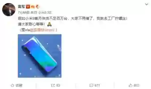 雷军也在近日确认了林斌的说法。雷军确认称,小米9总量备货不少,争取首月供货超百万台。为了更加赢得网友的新任,雷军也立下军令状,称如果小米9首月供货不足百万台,就将亲赴工厂拧螺丝!