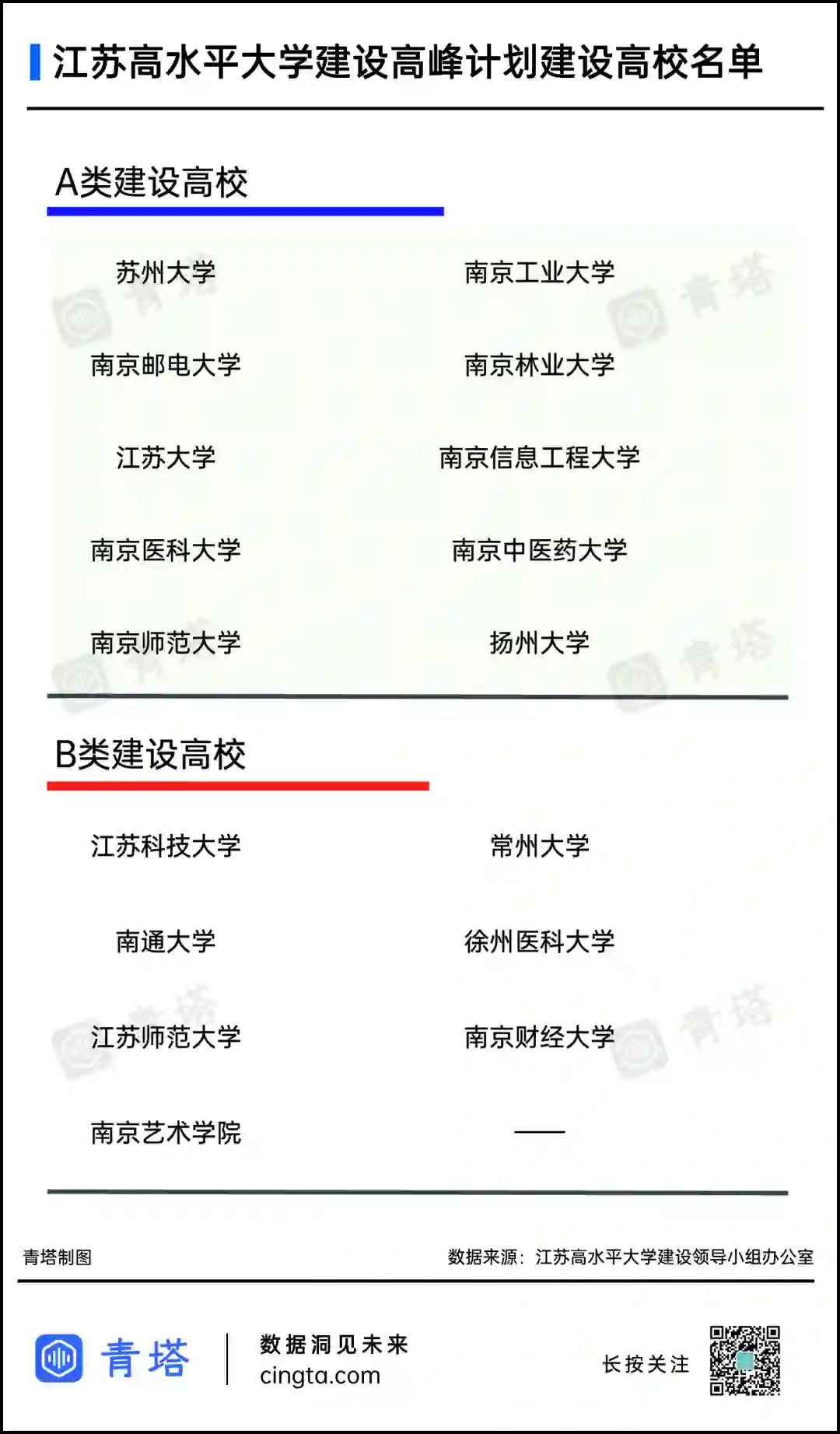 本次获批江苏高水平大学建设高峰计划建设高校共17所,其中A类建设高校10所,B类建设高校7所。