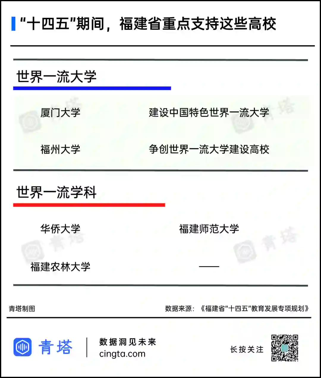“十四五”时期,福建省将分类推进“双一流”建设,支持厦门大学建设中国特色世界一流大学;支持福州大学争创世界一流大学建设高校,整体办学实力跻身全国50强;支持华侨大学、福建师范大学、福建农林大学争创世界一流学科建设高校。