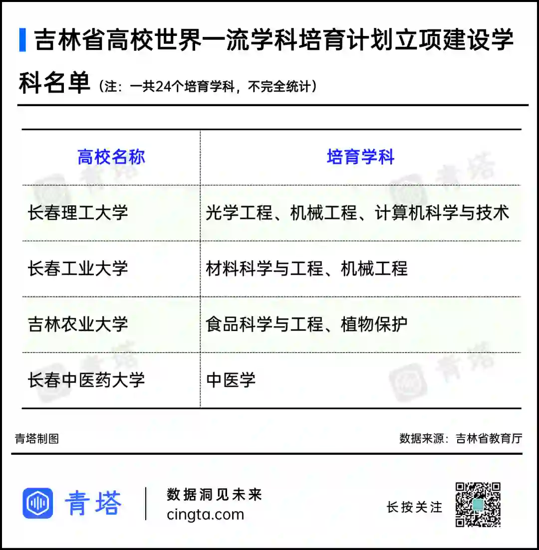 截至目前,长春理工大学、长春工业大学、吉林农业大学、长春中医药大学等高校,均已官宣入选学科。其中,长春理工大学有“光学工程”等3个学科入选,数量居吉林省属高校第一。