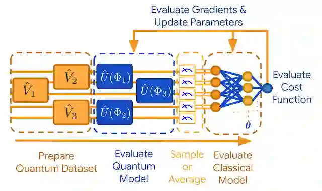 于是只能退而求其次,谷歌的NISQ处理器需要与传统的处理器进行协同才能有效地抑制噪声的影响。这种硬件的协同也同样造成算法上的协同,因此便有了量子-经典混合模型,其中模型的量子部分在量子处理器上进行处理,而经典部分则在经典处理器上进行处理。