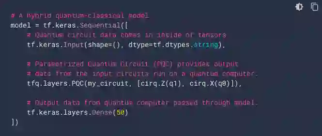 更为直白一点,相关量子算法的研究可以调用 TFQ 内部的计算框架,然后用 Python 编程完成运算。另外,可以使用标准Keras功能进行训练。
