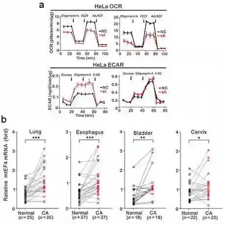 图示:a.mtEF4与细胞能量代谢关系;b.癌变组织mtEF4表达升高。