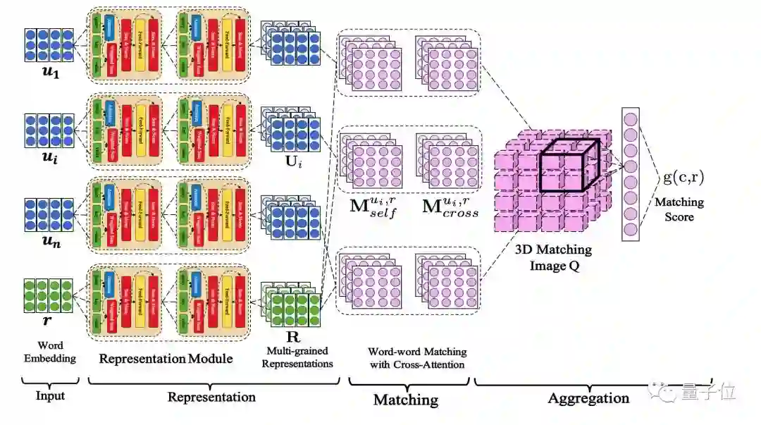 通过从词嵌入中叠加注意力机制,逐渐捕获不同颗粒度的语义表示。这些多粒度的语义表示有助于探索上下文和回答的语义依赖。