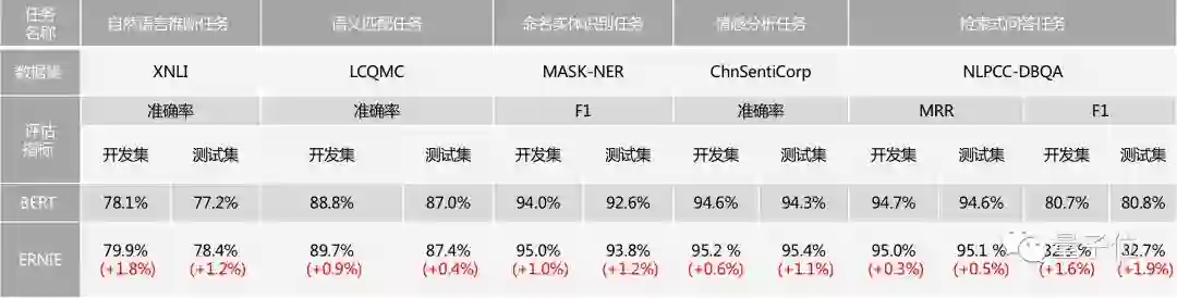 ERNIE在语言推断、语义相似度、命名实体识别、情感分析、问答匹配等自然语言处理(NLP)各类中文任务上的验证显示,模型效果全面超越 BERT,如下表所示。