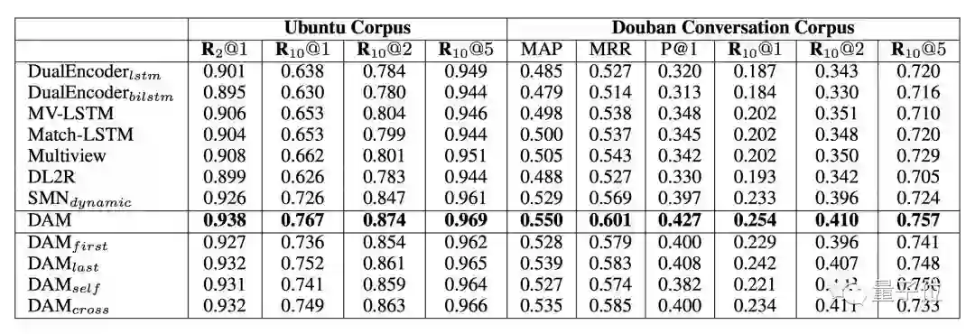 该模型在Ubuntu和豆瓣对话两个语料库上测试了多轮对话任务,如下表所示,相比其他模型有最优的效果。