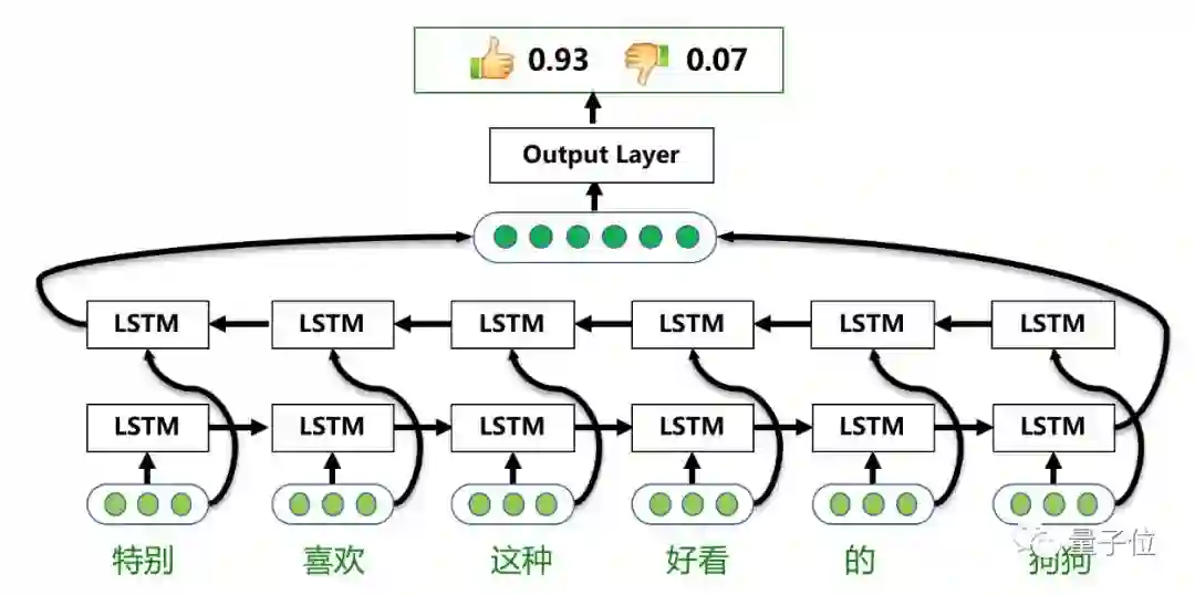 总体来说,基于Bi-LSTM的情感分类模型包括三层:单词语义层,句子语义层,输出层。