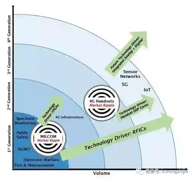 在这些市场中,推动软件无线电发展的技术是来自亚德诺半导体(Analog Devices)等公司的射频集成电路(RFIC)和来自赛灵思(Xilinx)等公司的具有成本效益的数字信号处理器(DSP)密集型现场可编程门阵列(FPGA)的出现。这两种技术的结合,满足了军事战术电台市场数十亿美元的需求,也搅起了一些“市场波动”,这对软件无线电技术发展的影响是巨大的,远远超过了单一军事通信市场的影响。联合战术无线电系统(JTRS)计划为用于军用电台的软件无线电技术的开发和产品化提供了资金,形成了包括半导体、工具和软件公司在内的供应商的强大生态系统。在工具方面,软件无线电要求波形尽可能在不同的硬件平台之间移植,促进了软件通信架构(SCA)核心框架以及电子设计自动化(EDA)和半导体公司更好的编程工具的产生发展。