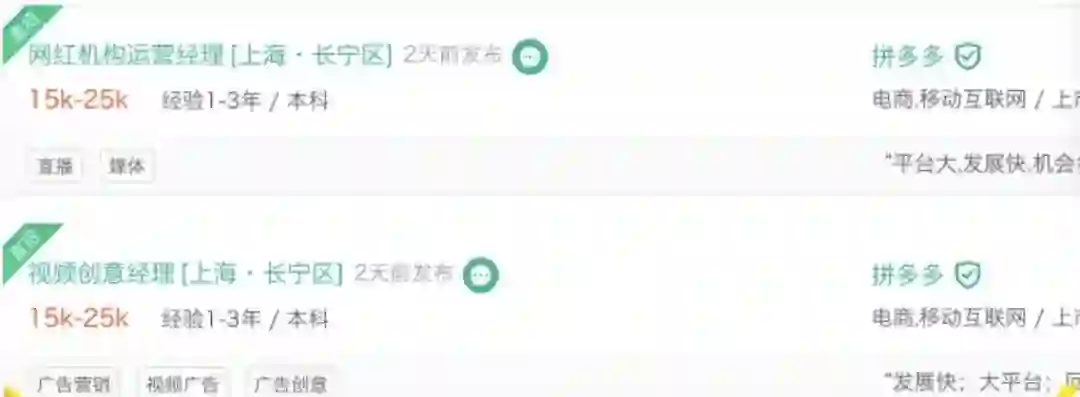 拉勾网显示,拼多多正在招聘“网红机构运营经理”、“视频创意经理”等与直播相关的职位。
