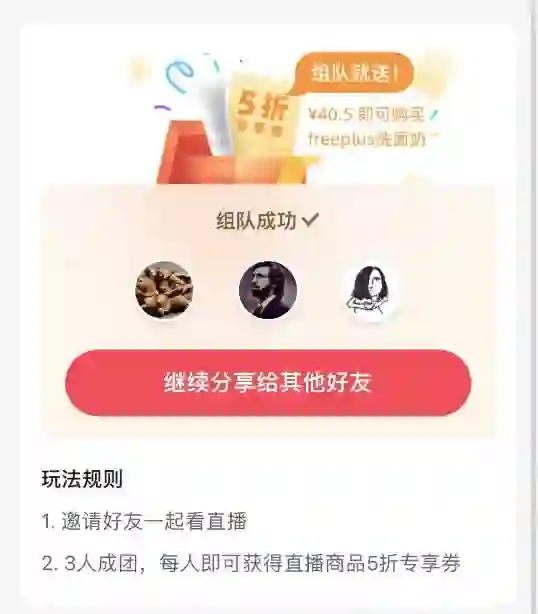 用户可以通过“好货内购”小程序,邀请好友观看直播,组队成功后可获得直播商品专享折扣券。