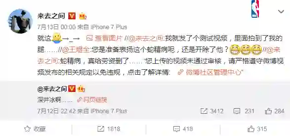 与此同时,微博方面虽然表示非节目类视频不受影响,但其对用户上传内容的审核力度也在不断加大。日前,微博CEO王高飞吐槽自己发段视频拍到了自己的腿就被删除了,笑骂其“蛇精病”。
