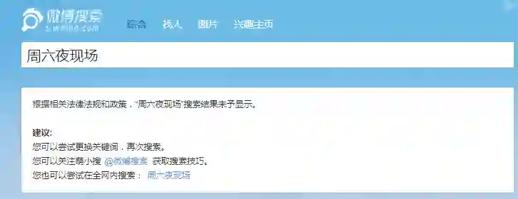 在微博输入“柯南秀”、“吉米秀”、“周六夜现场”等都已显示无效,包含这些关键字的相关微博账号也是显示“根据相关法律法规和政策,搜索结果未予显示。”