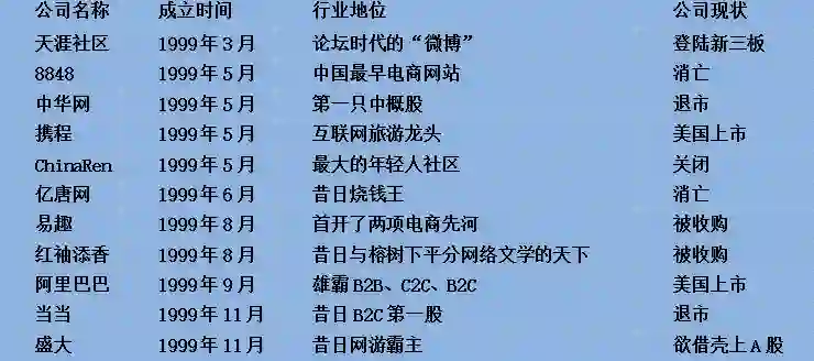 1999年,阿里巴巴、中华网、当当、携程、盛大、易趣、天涯社区、ChinaRen、8848、红袖添香、亿唐网,这11家互联网公司站于同一起跑线。