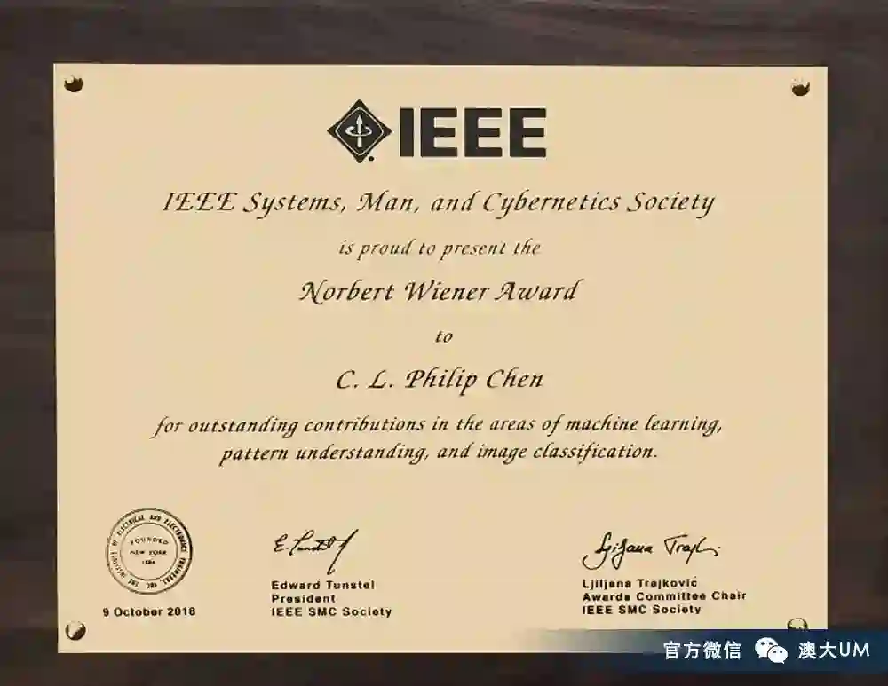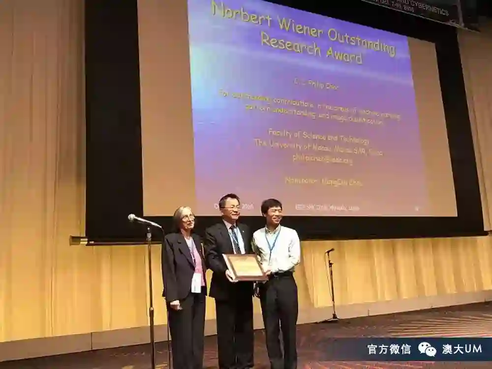 中国自动化学会副理事长、欧洲科学院院士、澳门大学科技学院讲座教授陈俊龙参加于日本宫崎市召开的「2018年IEEE系统、人与控制论国际会议」,并获国际奖项「诺伯特·维纳奖」(Norbert Wiener Award)。该奖是系统与控制论领域的最高奖项,表彰了陈俊龙在机器学习、模式理解、图像分类等领域的研究作出的杰出贡献。