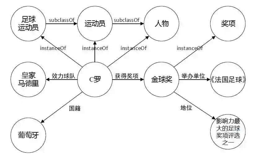 比如“C罗”是一个实体,“金球奖”也是一个实体,他们俩之间有一个语义关系就是“获得奖项”。“运动员”、“足球运动员”都是概念,后者是前者的子类(对应于图中的subclassOf 关系)。