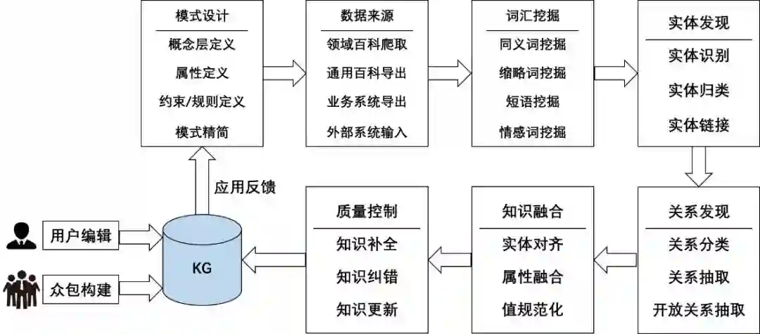 经历了上述步骤之后得到一个初步的知识图谱。在实际应用中会得到不少反馈,这些反馈作为输入进一步指导上述流程的完善,从而形成闭环。此外,除了上述自动化构建的闭环流程,还应充分考虑人工的干预。人工补充很多时候是行之有效的方法。比如一旦发现部分知识缺漏或陈旧,可以通过特定的知识编辑工具实现知识的添加、编辑和修改。也可以利用众包手段将很多知识获取任务分发下去。如何利用众包手段进行大规模知识获取,是个十分有意思的问题,涉及到知识贡献的激励机制,我前几年有个题为《未来人机区分》的报告,专门讨论如何利用知识问答形式的验证码来做知识获取,可以搜索此文获取更多信息。