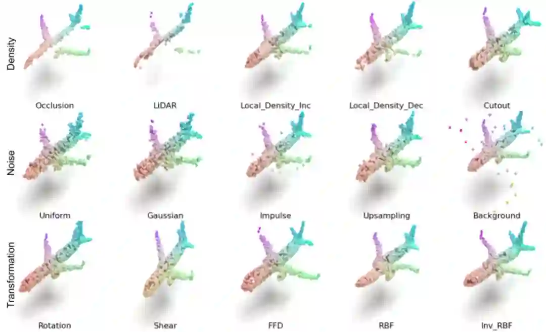 该研究提出了一个新颖并且全面的 3D 点云识别稳健性分析数据集 ModelNet40-C。研究者提出并构建了了 75 种不同的失真类型和程度来模拟真实场景中由于物理限制、传感器准确度限制、以及处理过程中造成的点云失真和损坏。ModelNet40-C 包含 185000 个不同的点云数据。