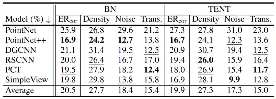 表 3. 在标准训练下不同模型在 ModelNet40-C 上的错误率。