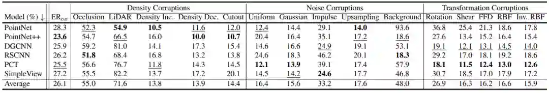 如表 1 所示,该研究在 PointNet, PointNet++, DGCNN, RSCNN, PCT, 以及 SimpleView 六个模型上进行了基准测试。研究者总结了一些发现: 1) “遮挡”和 “激光雷达” 给点云识别模型造成了极高的错误率。2) 小角度的 “旋转” 仍然会很大程度影响点云识别性能。3) “背景”和 “脉冲” 噪声给大部分模型带来了意想不到的挑战。