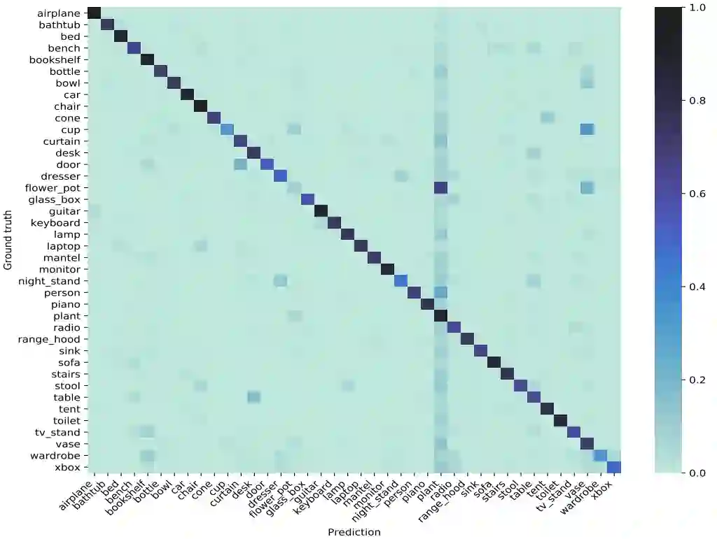 研究者阐述了这些失真是点云应用中非常常见的,并且保证了生成的数据集仍然保持了原有的语义,如图 2 所示。图 3 展示了在 ModelNet40-C 上 6 个模型的平均混淆矩阵,对角线上的比重依然很高,这同样交叉验证了 ModelNet40-C 的语义不变性。