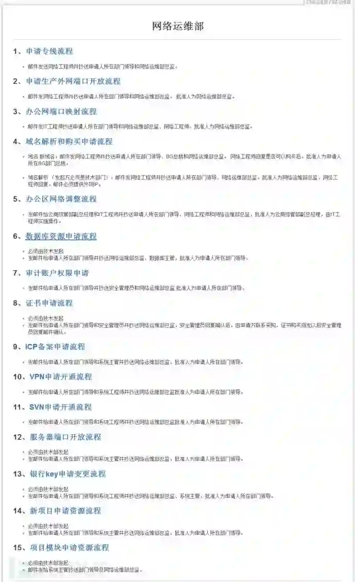 三张表,1组织架构图,2产品和负责人对应表,3全网拓扑、逻辑架构、物理图、各系统间调用关系、数据关系流等,后面还有各类技术介绍,讲的很全面。
