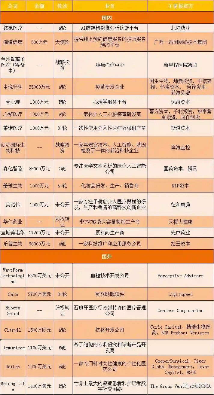 涉及健康管理、医学影像、人工智能、医疗器械、生物医药、医疗媒体等领域。