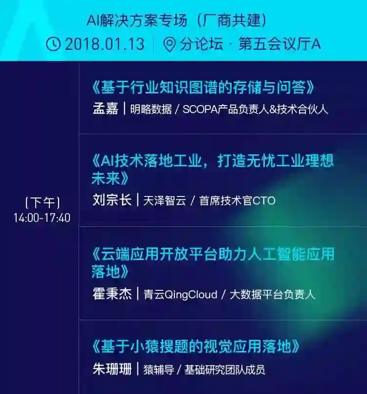 “AI 解决方案专场”:来自青云、明略数据等企业的技术专家们将就他们如何落地 AI,如何利用知识图谱数据存储、优化搜索引擎、实现复杂推理,构建智能对话机器人的框架和方法,AI 应用于具体工业场景的技术框架和设计理念,如何利用云端的数据和计算能力为 AI 加码等进行「巅峰级」论道。