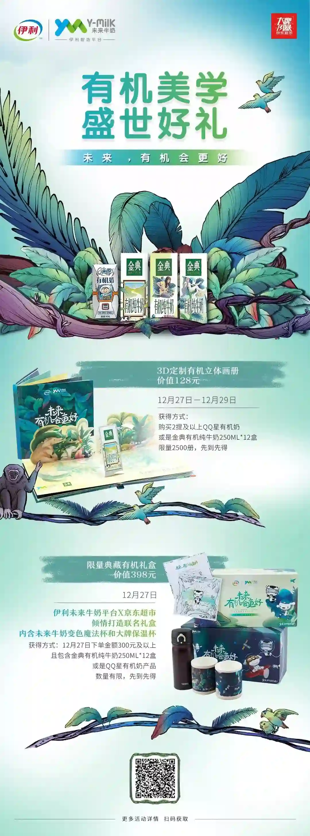 深受消费者喜爱、致力于为消费者构建更好未来生活的京东,这次也携手伊利未来牛奶平台,共同成为有机生活倡导者,在上千个优秀创意中选出了4个最优秀的“有机概念”,在年末为消费者献上了设计师款限量包装产品——金典有机纯牛奶&QQ星有机奶。