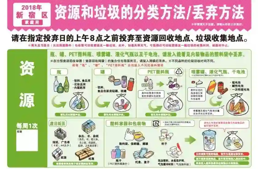 根据日本的垃圾分类法律,除了分为可燃和不可燃垃圾外,资源性垃圾还细分为塑料、纸张、旧报纸杂志、旧衣服、塑料饮料瓶、听装饮料瓶等等。另外,换电视、冰箱等家电还必须和收购商之类的专人联系,并支付一定费用。大件的垃圾每年只能最多扔4件,否则需要另外付钱。