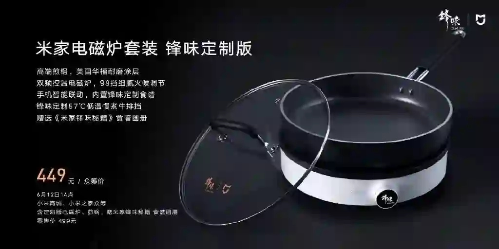 此外还有米家电磁炉套装锋味定制版,套装内包含电磁炉 * 1 煎锅 * 1 。套装内煎锅使用了美国华福耐磨涂层,支持 99 档细腻控火。米家电磁炉还专为谢霆锋设计了 57 度低温慢煮牛排档,智能联动 100 多种联动模式,可以通过手机端控制电磁炉的加热时长和时间,售价为 499 元。