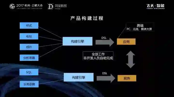 对于应用端的构建引擎,需要注意的是非开发人员,通过构建引擎,只需要输入四个要素——样式、布局、组件以及分析思路,就能构建出一个基于DSL描述的一个应用;同理,在服务端也是一样的,非开发人员通过输入SQL,和一些业务逻辑的实现,就能够生成一个基于DSL描述的服务。在应用层,上述的服务是可以实现PC、无线和大屏的跨端。