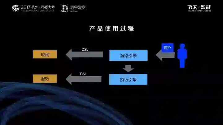 在应用和服务中间是DSL,所有的应用和服务,最终都会按照DSL标准来配置。通过数据产品开发平台构建完成的应用和服务,并不是一个独立运行的实体,它实际上是一个配置,渲染引擎、执行引擎等可以加载和运行这个配置;通过构建引擎生成一个配置,来实现不同国家、不同机房、不同终端都能运行的目的。