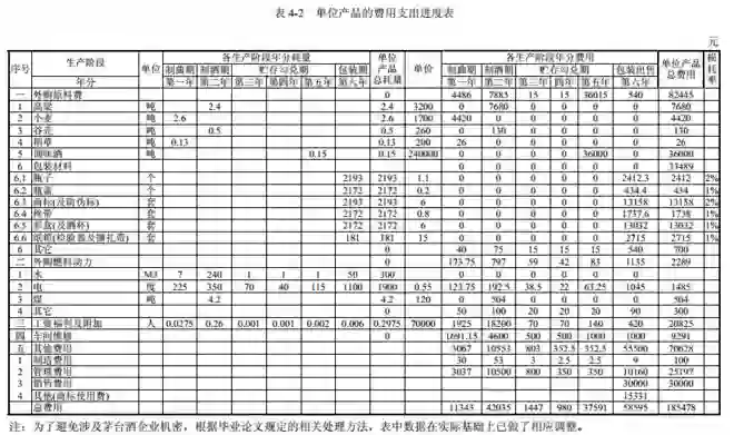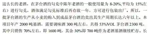 资料五:在一篇硕士论文(作者为茅台待了十几年的老员工)《2010年新增2000吨茅台酒技改工程投资可行性研究分析》中,可以查到的相关信息显示(参见下面两图),使用的调味酒(前注:调味酒为酒龄大于 15 年的陈老酒)大约占到基酒的15%,按照这里的说法,2000吨基酒(2000吨为设计产能)需要300吨调味酒。