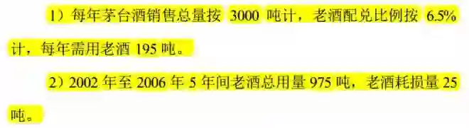 资料二:根据茅台招股书附录(2001)给出的成本测算表(见下图),每生产一吨的53度茅台酒大致需要0.8514吨的基酒,还需要0.1486吨的外购老酒。招股书附录另一处对收购集团老酒进行财务测算提到的老酒配兑比例则按6.5%(见下图),与上一处不一致。