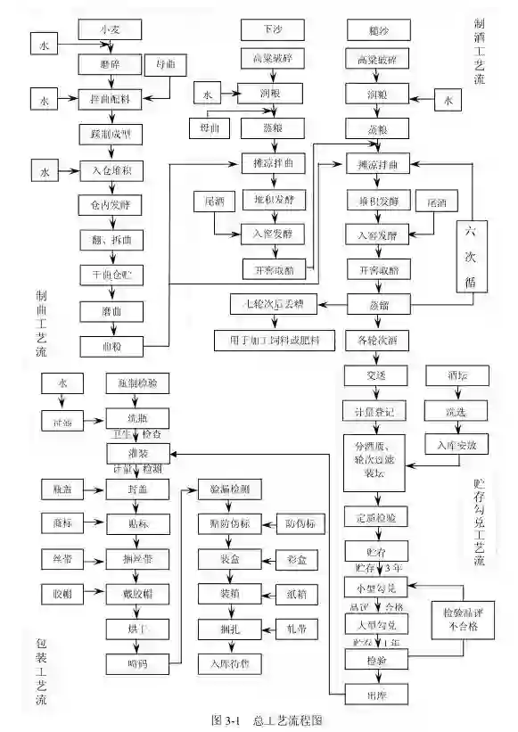 首先看下茅台酒生产工艺流程图(见下图),分为四个部分:制曲、制酒、贮存勾兑和包装。其中前两个步骤的最终结果就是生产出共七个轮次基酒。基酒分酒质、轮次过滤后装坛,再经检验后贮存三年。其后进行勾兑(小型勾兑和大型勾兑),勾兑后再贮存一年(53度酒需要1年,低度酒需要6个月),检验合格后进行包装即形成可供出售的商品酒。