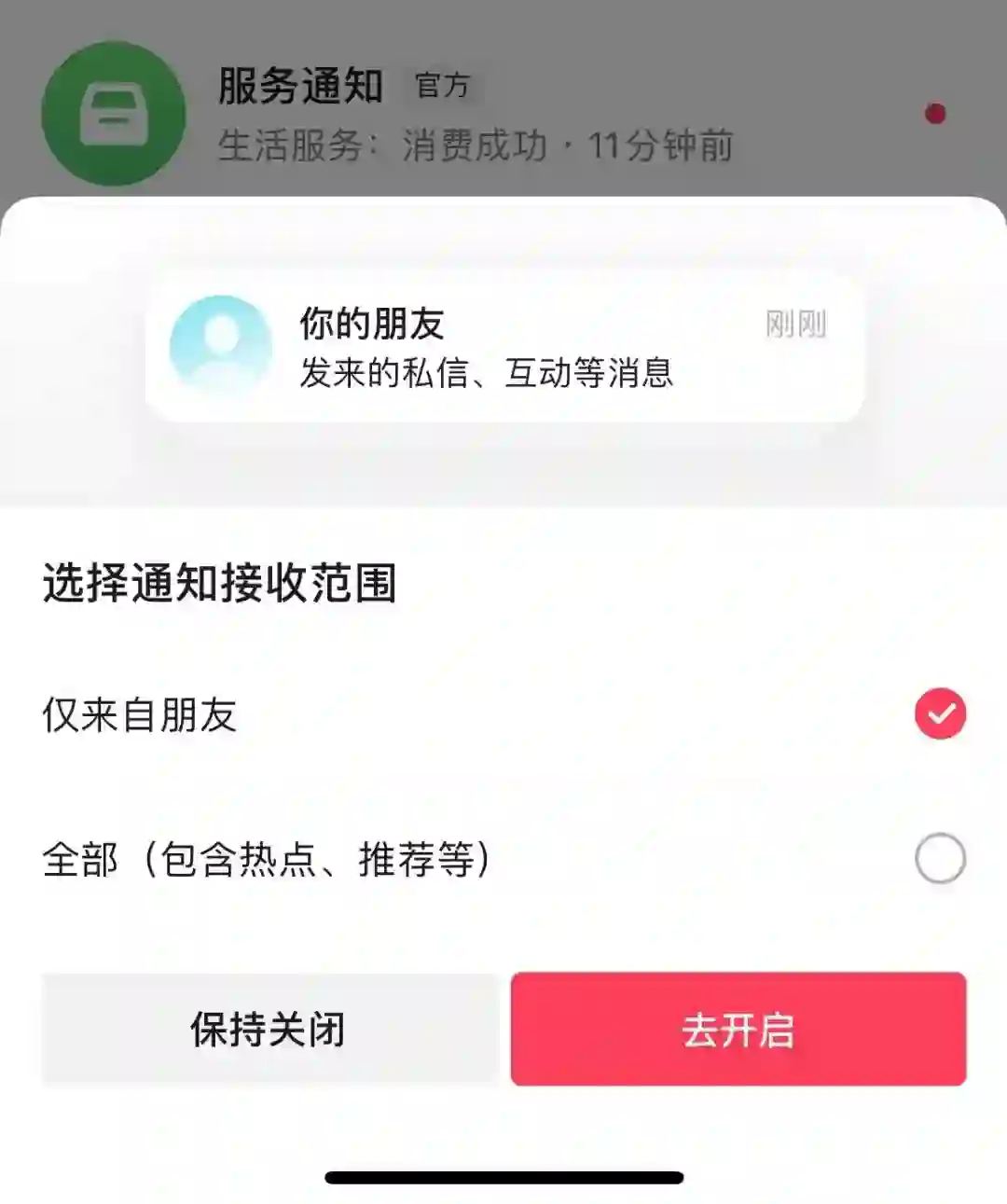 每次打开抖音的好友列表,抖音都要询问我选择通知接收范围,但我已经点了第N次“保持关闭”消息通知了,还要一直弹窗。
