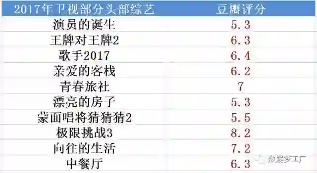 豆瓣评分显示,四季度播出的《亲爱·的客栈》为6.2分,《青春旅社》为7.0分。而今年一季度,同是由吴彤团队打造的《王牌对王牌2》,同样是流量明星加持的思路,收视率和网络播放量双高,其豆瓣评分也有6.3分。而被一些观众拿来对比的《我是歌手》从第一季开始就是收视与口碑双收,《歌手2017》(《我是歌手5》)豆瓣评分为6.4。