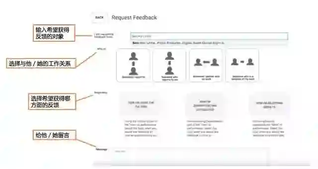 当业务经理希望知晓其他人对自己工作的看法时,他们只需进入操作平台,在反馈页面选择希望获得从谁那里获得反馈以及希望听取哪方面的建议,这个请求就会发送给对方。在对方做出评价后,便能在系统中查询到具体的反馈意见。