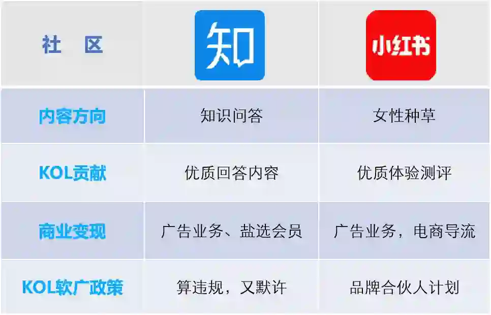 在内容方向方面,从知识问答社区逐渐引导上线知识付费,处在竞争加剧的红海市场,而且平台逐渐内容泛化,分散的内容定位可以成为公域营销地,但也只能成为免费的流量池;小红书作为女性种草社区,为电商平台导流,在赛道选择上更垂直和细分,营销目标也更精准。