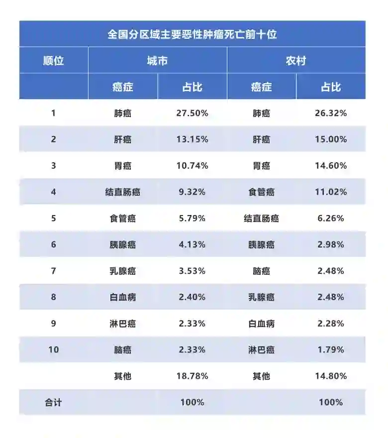 城市地区与农村地区的恶性肿瘤死因顺位不同,城市地区主要恶性肿瘤死因依次为肺癌、肝癌、胃癌、结直肠癌和食管癌,农村地区主要恶性肿瘤死因依次为肺癌、肝癌、胃癌、食管瘤和结直肠癌,城市地区与农村地区前10位恶性肿瘤死亡分别占城乡全部恶性肿瘤死亡的81.30%和85.20%。