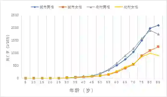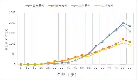 年龄别死亡率变化趋势和发病相似,随年皊增加逐渐上升。男性的年龄别死亡率高于女性。0~39岁人群中,男性年龄別死亡率略高于女性。40岁及以上人群中,同年龄组男性与女性死亡率的差异随年龄的増加而显著增大。城乡人群的年龄别死亡率变化趋势相似。除0~4岁和75岁及以上年龄组农村男性死亡率低于城市男性,其他年龄组农村男性死亡率高于城市男性。20-74岁年龄组农村女性死亡率高于城市女性,其他年龄组城市女性死亡率高于农村女性。