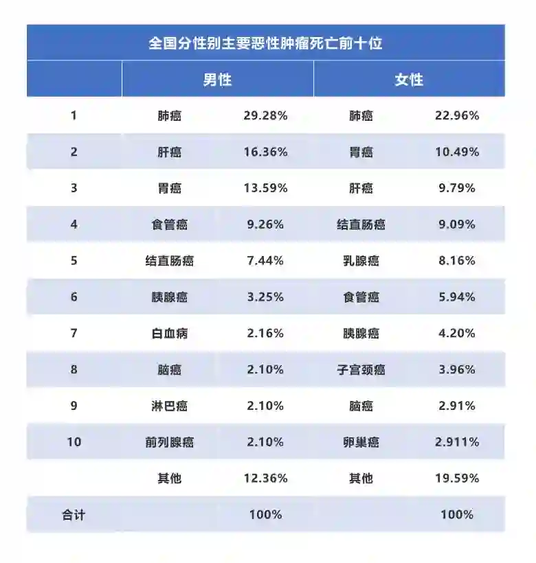 男性和女性的恶性肿瘤死因顺位略有差异。男性依次为肺癌、肝癌、胃癌、食管癌和结直肠癌等,男性前10位恶性肿瘤死亡约占男性全部恶性肿瘤死亡的87.60%。女性主要恶性肿瘤死因顺位依次为肺癌、胃癌、肝癌、结直肠癌和乳腺癌,女性前10位恶性肿瘤死亡约占女性全部恶性肿瘤死亡的80.50%。