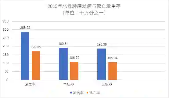 2015年恶性肿瘤发病率为285.83/10万,中标率(中标率:人口标准化率按照2000年中国标准人口结构)为190.64/10万,世标率(世标率:人口标准化率按照Segi's世界标准人口结构)为186.39/10万,累积率(0~74岁)为21.44%。2015年中国恶性肿瘤死亡率为170.05/10万,中标率为106.72/10万,世标率为105.84/10万,累积率(0~74岁)为11.94%。