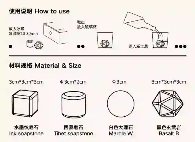 大理石:选用白色浅纹大理石制作圆球形冰酒石块,质地通透清凉,洁白无瑕,圆形营造出光泽,高贵雅致。