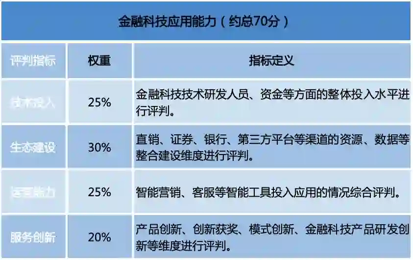 ① 上述2大评价维度,金融科技资源能力约占30分,金融科技应用能力约占70分,总分为100分,星级评判标准是:得分大于等于90分为五星,得分70-90之间为四星,得分60-70分为三星,得分50-60分为2星,得分低于50分为1星,数据收集不全面无法评判标注为斜杠(/),相关资料评判考虑因素的数据来源于访谈、财报及其他公开资料,不排除存在其他未获取数据的潜在影响。