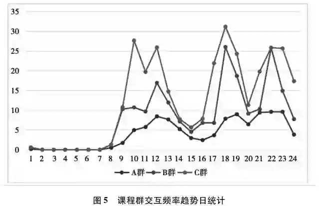 从周统计来看,三个课程群的交互峰值均出现在上课的前一天,最低谷则出现在课程结束后的第二天(图4)。上课的前一天学习者有了解该周次课程安排的需求,会出现交互的高峰;课程结束后的两天意味着一周次课程周期的结束,学生会相对放松,对该课程投入精力减少。